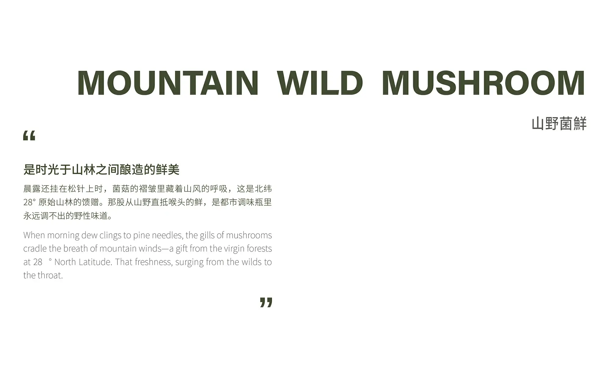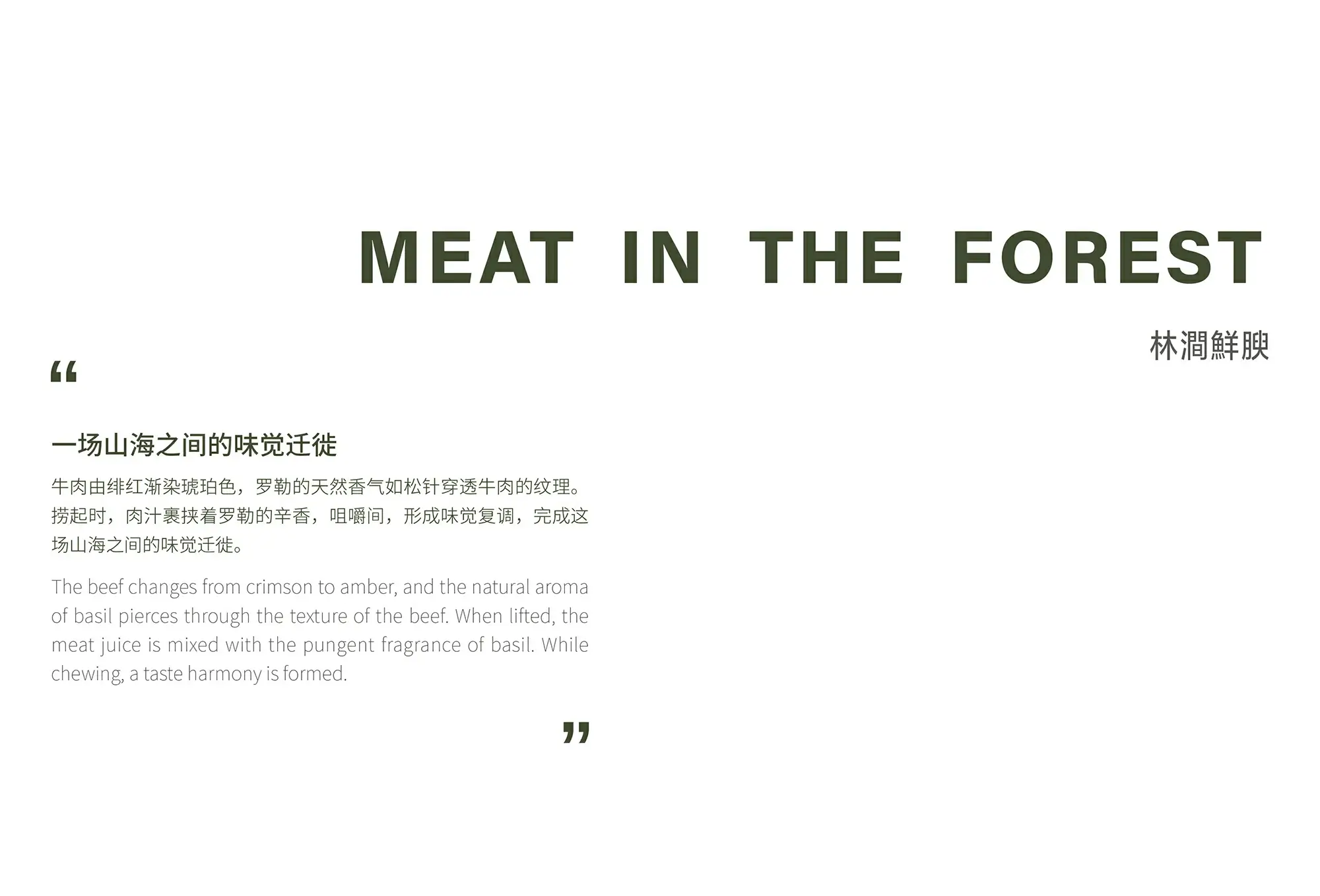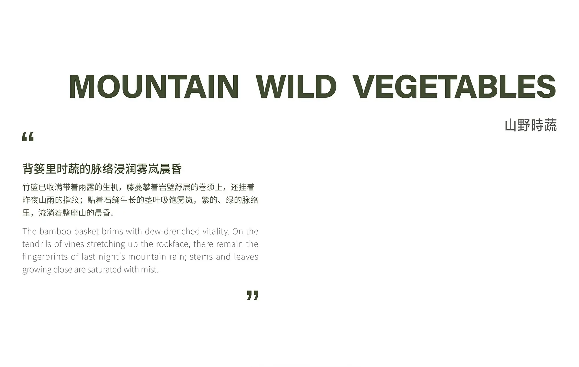 以 “山海共生” 为设计理念,将菜牌重构为一本《山海风物志》,以山野美学语言串联起食材本味与地域文化。