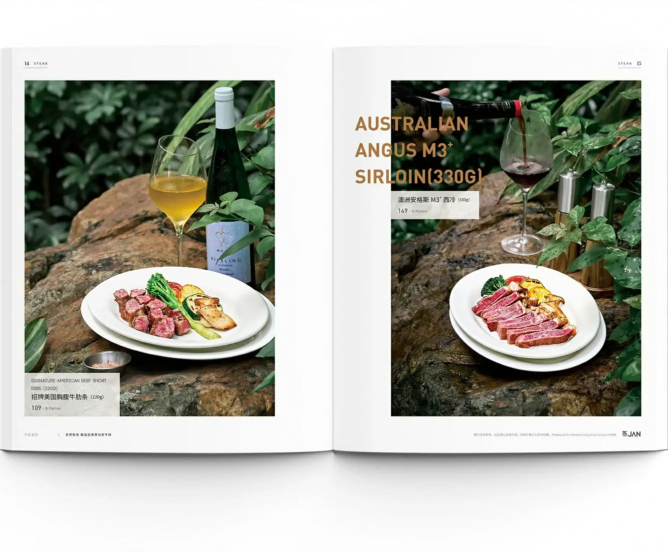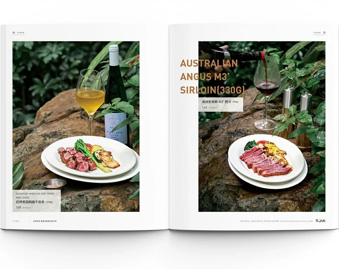The menu design seamlessly blends natural textures with upmarket elegance, framing steak dishes against outdoor scenery while presenting ingredients and culinary details in high definition. With minimalist, sophisticated layouts and clear information hierarchy, the visual narrative—from pasture to plate—showcases the careful selection of premium ingredients, allowing diners to visually appreciate the restaurant's commitment to refined, quality cuisine.